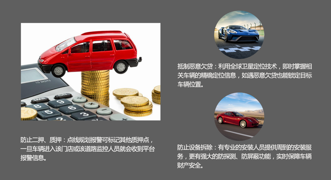 车贷、担保、银行按揭、抵押车、租赁公司遭遇骗租、变现、异地抵押,拆除车辆安装的GPS后,进行非法车辆买卖,导致车辆无法监控,给找车带来了重重困难。无线GPS,无需接线、更隐蔽。为租赁、信贷、按揭、分期、抵押车提供专业打造的车辆安全GPS解决方案和产品。