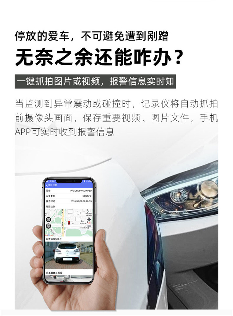 本产品是一款 4G及定位体双路摄像头,本产品是一款多功能于一体的车联网的产品,配备高清镜头,大光圈、长焦距、超大广角的车内车外双路摄像头,1080P 高清视频录制使拍摄画质更加清晰; 4G 模块,4G 全网通支持全球频段,支持外插大容量TF 卡,TF 卡可以拆装于其他设备回放观看视频,并同步悉知 GPS 的行车轨迹;本产品还具备有高清车载 DV 摄像、一键报警、抓拍、内置GPS+北斗双模精准定位和 GPS 行车轨迹,使驾车出行更安全放心,是一款性价比非常高可以用于私家车,物流,网约车,卡车,租赁,抵押车,特种车辆等