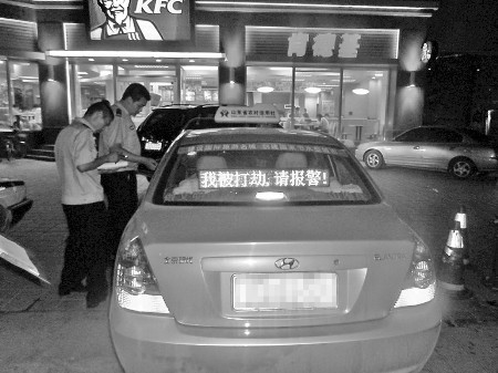 21日晚上9点左右,泰城市民卢先生开车经过泰安市中医医院,看到在他前面的一辆出租车后面的LED显示屏上出现了“我被打劫,请报警”的字样。“由于当时出租车车速比较快,我还以为看错了呢,我又紧踩油门追上去想看清楚。”卢先生说,当他靠近出租车时证实自己并没有看错。因为担心出租车司机有危险,卢先生一边跟着出租车,一边拨打了110报警电话。