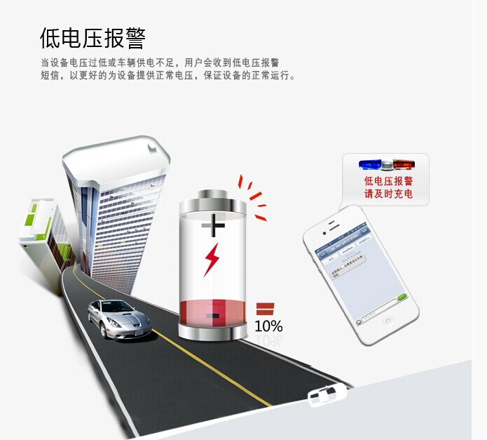 9、低电报警设计,及时提醒避免电压过低导致无法定位,保证车辆为设备提供正常的电量。