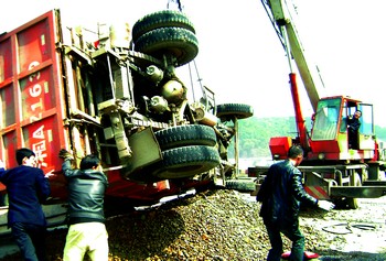 2009年3月14日,吊车正在桥面上对发生侧翻的渣土车实施救援。 彭伟 小刘军 摄