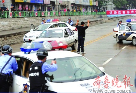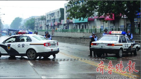 见示意停车无效,根据犯罪嫌疑人逃窜的路线,槐荫巡警大队的民警在经一纬十二路路口,布置了两辆巡逻车,并在马路中间放置了阻车器,以拦截被抢车辆。