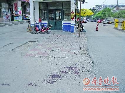 22日上午天福苑小区门口仍可见斑斑血迹 本报记者 王若松 摄