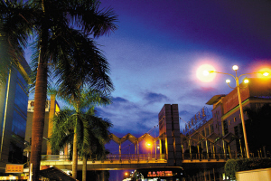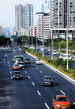 灯火辉煌、树影婆娑,前进路是宝城的标志道路。